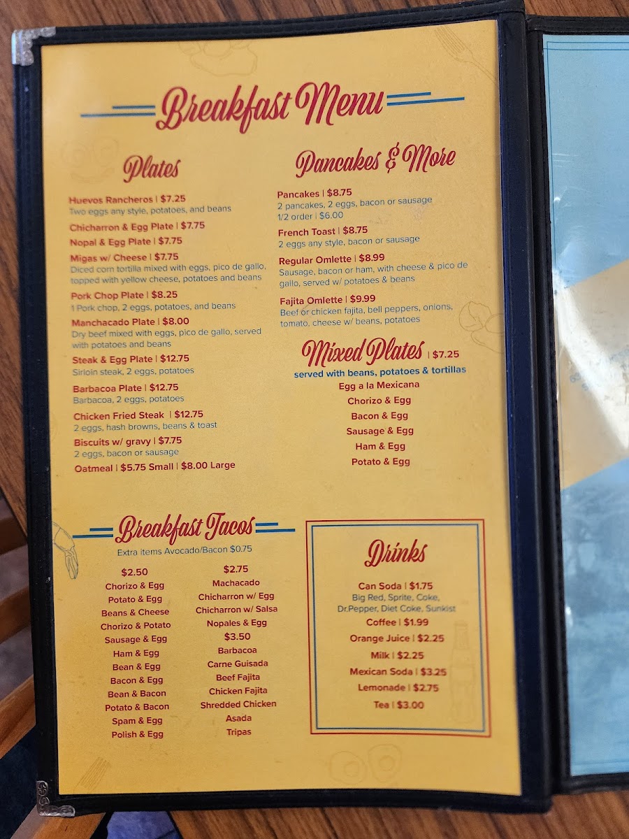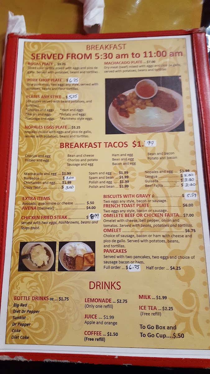 Sausage, bacon or ham, with cheese and pico de gallo, served with potatoes and beans.